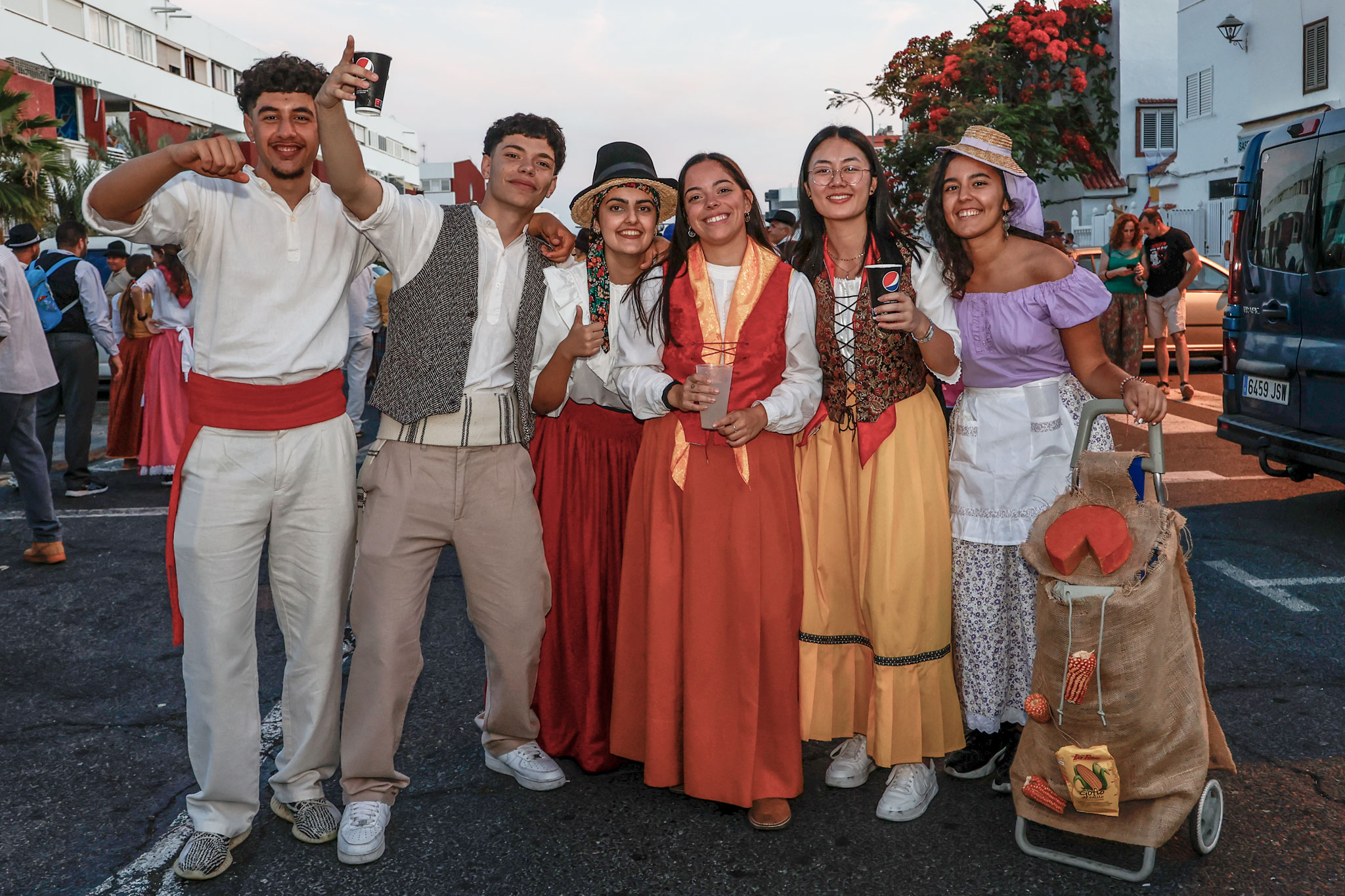 Maspalomas celebró hoy su ofrenda-romería en honor a San Fernando renovando su recorrido e incrementando la participación de carretas, agrupaciones y romeros que han formado parte de la comitiva. A las 18:00 horas partieron de la Plaza de Timanense, seis carretas con sus respectivas Agrupaciones Folclóricas que desde bien temprano afinaban sus instrumentos y comenzaban a quemar el carbón y encendían sus planchas con las que cocinar la carne de cochino, los pinchitos o las chuletas que repartían por el camino a los romeros, y compartían con los curiosos que se distribuían a ambos lados de las calles por donde pasó la comitiva. En el menú no faltaron los huevos duros, el queso de la tierra, el bizcocho ni, por supuesto, las papas arrugás.